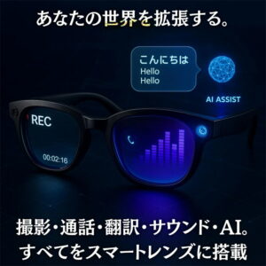 【1年保証付き】スマートグラス カメラ付き 録画 録音 映像 スマートメガネ iPhone 眼鏡 音楽再生 通話可能 Bluetooth5.3 日本語説明書付 近視用 サングラス マイク内蔵 AIワイヤレスメガネ 500W解像度 アプリ記録 高音質 誕生日 プレゼント ★収納ケース無料差し上げ★新世代!スマートグラス 映像 カメラ付き 翻訳 録画 録音 スマートグラス 眼鏡 録画 カメラ サングラス カメラメガネ カメラ付きメガネ カメラ搭載 1. 高性能カメラ機能:500W解像度、1080Pハイビジョン撮影(手ぶれ補正付き)、AIピクセル補正で高画質な写真動画を実現2. スマート音声システム:Bluetooth 5.3対応、内蔵イヤホンスピーカー(複合膜ラ喇叭採用)で音楽再生や通話を快適に、高精度音声認識とリアルタイム翻訳機能3. 多用途AIサポート:パノラマ型インテリジェント検索、画像認識(品物メニュー植物など自動識別)、WiFi 5GHz対応で高速通信4. 快適設計:ブルーライトカット機能、開放型ヘッドフォンで周囲音とシームレス切り替え、騒がしい環境でも明瞭な音声【スマートAl、生活の流れをリード】など業界をリードするAlビッグモデルにアクセスし、スマート境界を再定義します。